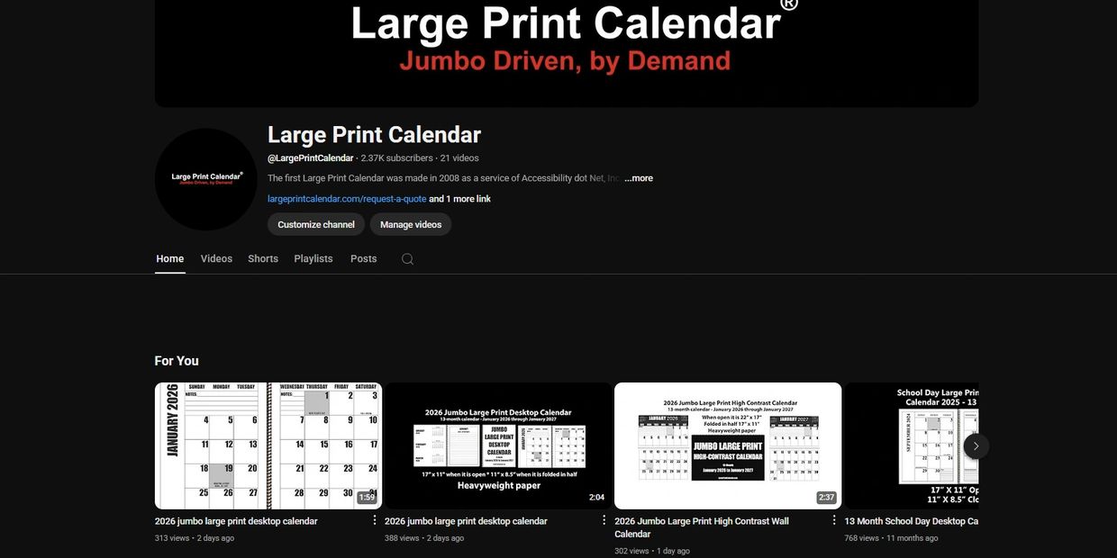 The first Large Print Calendar was made in 2008 as a service of Accessibility dot Net, Inc., who has been helping the blind and visually impaired since 1997.
